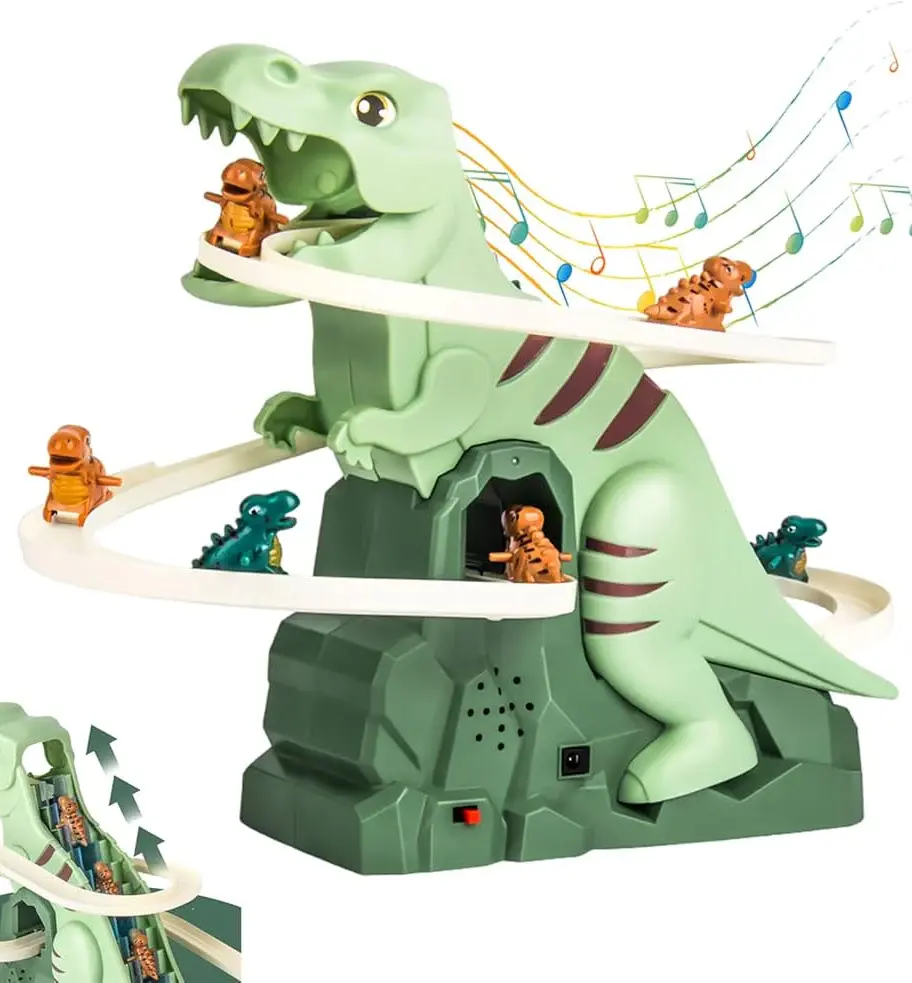 Con un diseño vibrante y lleno de energía, este juguete cautivará a los niños mientras se divierten con los efectos luminosos y sonoros que lo hacen aún más atractivo. Incluye 3 pequeños dinosaurios que se deslizan y suben las escaleras, brindando una experiencia divertida y realista. ¡Es fascinante ver cómo se mueven por el tobogán! Cada vez que los dinosaurios suben las escaleras, la música suena de manera animada, creando un ambiente lleno de ritmo y alegría para los niños.